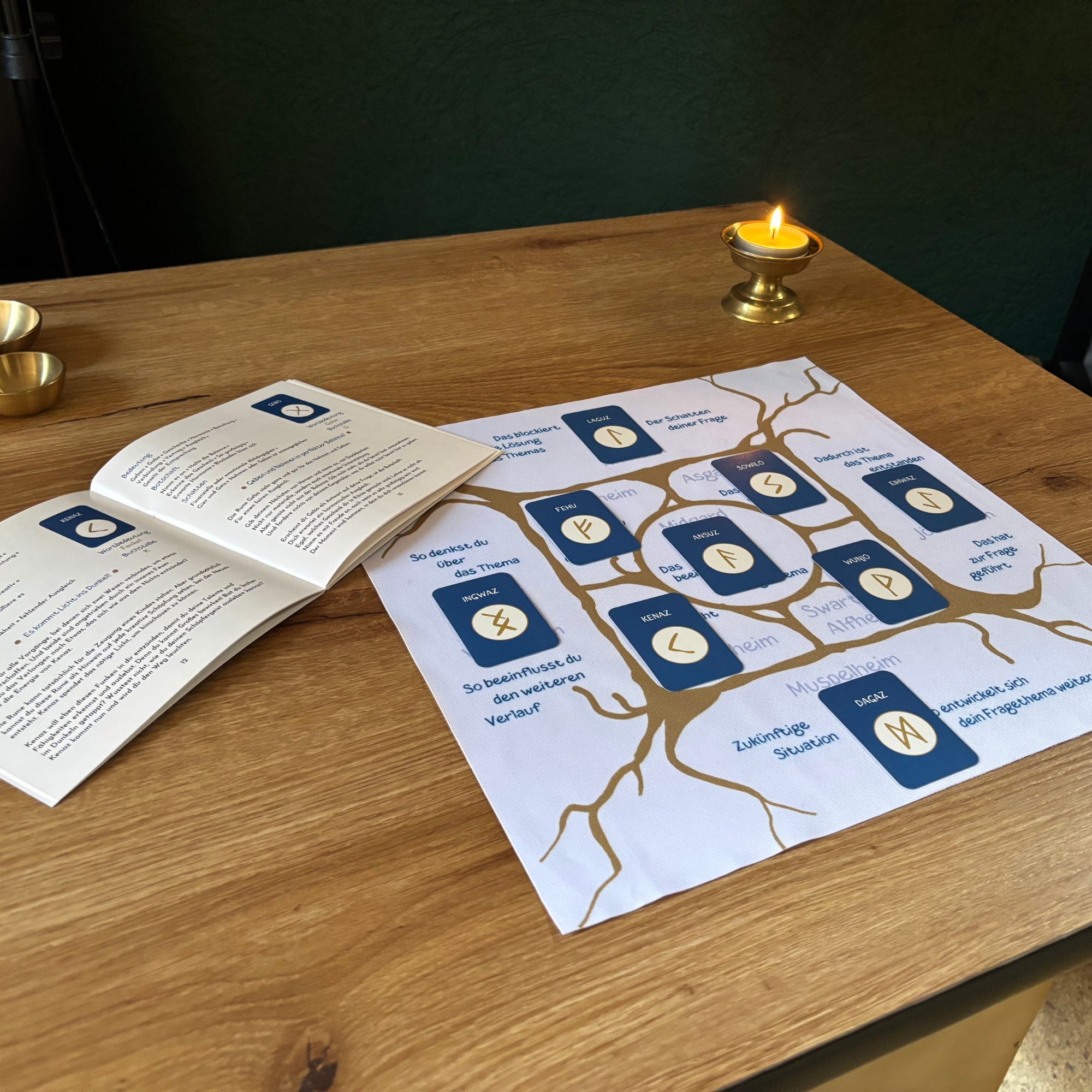 Auspacken, Legetuch ausbreiten, Karten mischen und auslegen und schon gehts los mit der Deutung! Du brauchst keine Vorkenntnisse. Du musst nicht mehr während des Deuten in einem Buch blättern. Lese nach dem auslegen nur was auf den Karten und dem Tuch steht und bekomme über diesen Weg sofort Botschaften über deine aktuelle Lebenssituation. Begleitet wird das Set trotzdem von einem Booklet. Dort erkläre ich dir, die Techniken in der Großen Tafel und vieles mehr.