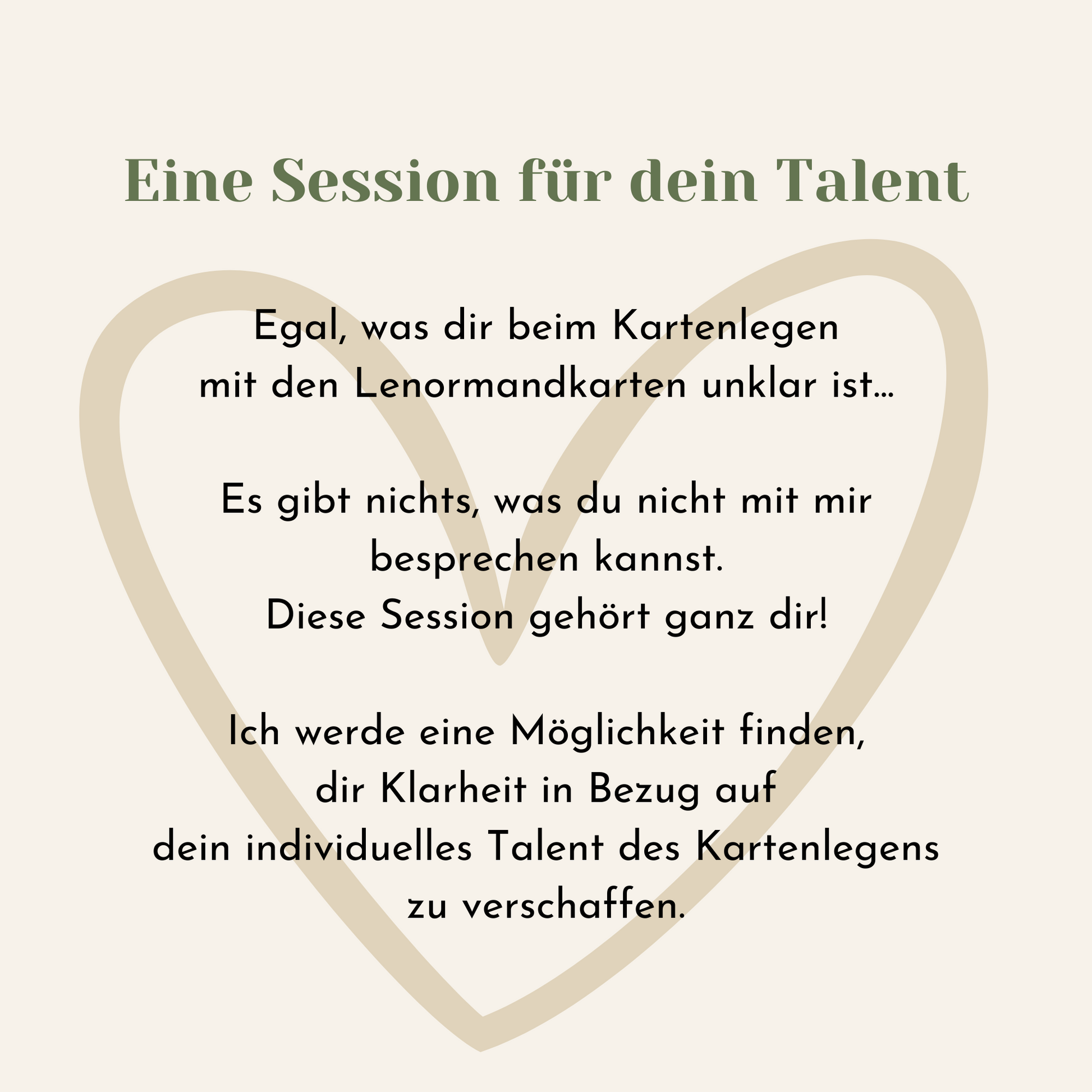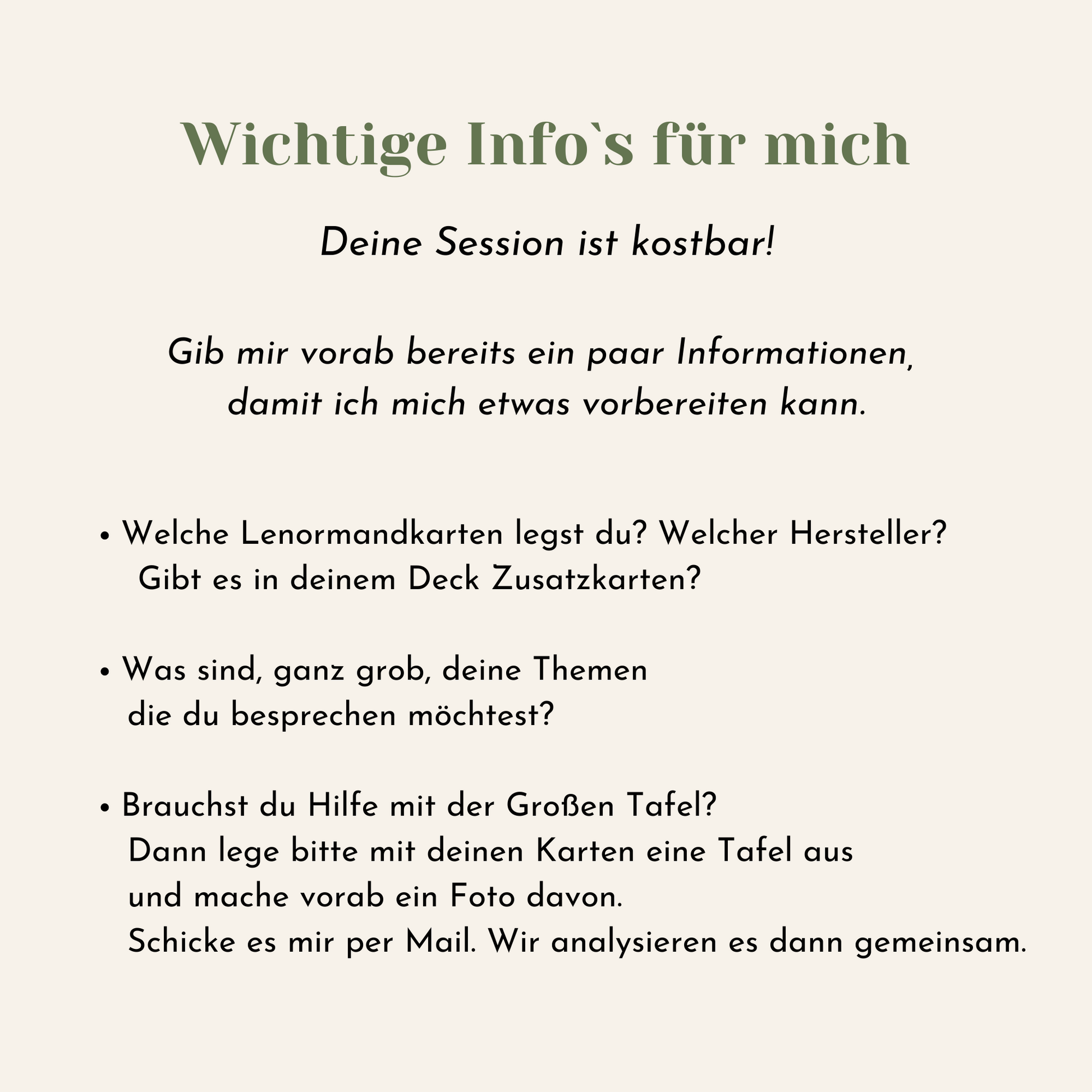 We will meet in a video call and discuss your individual questions regarding card reading with the Lenormand cards.