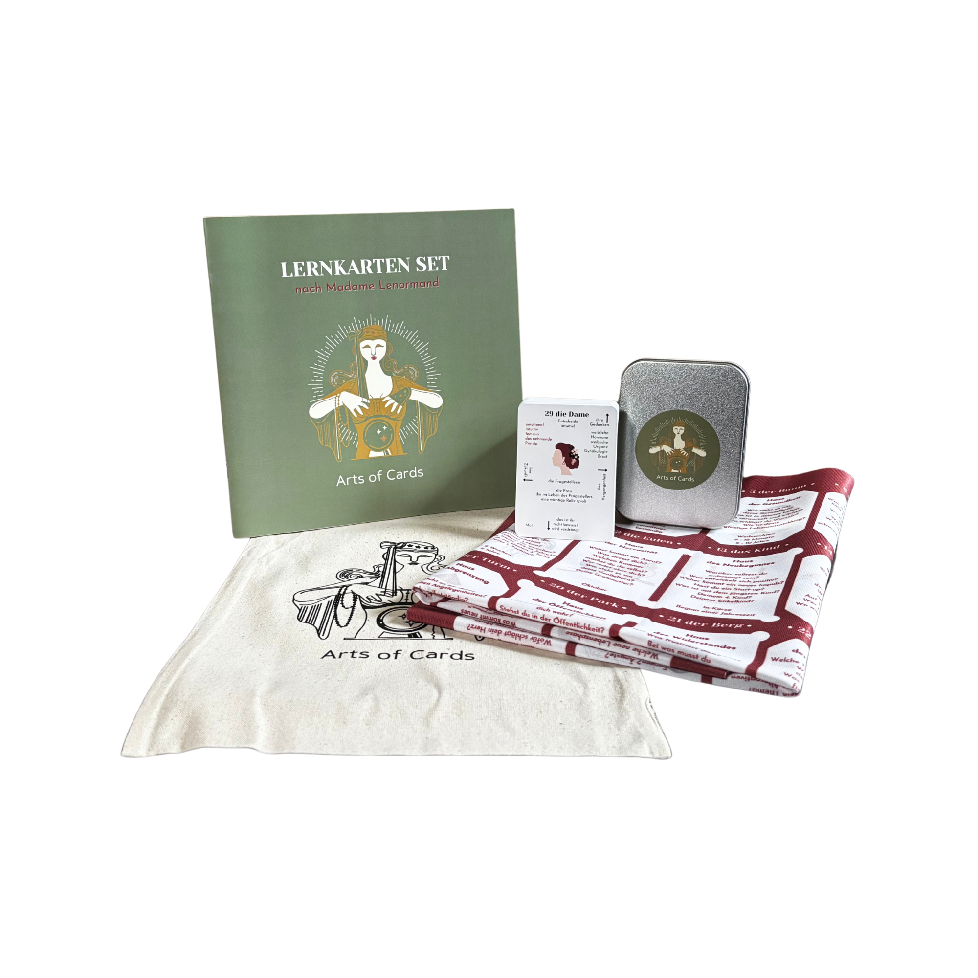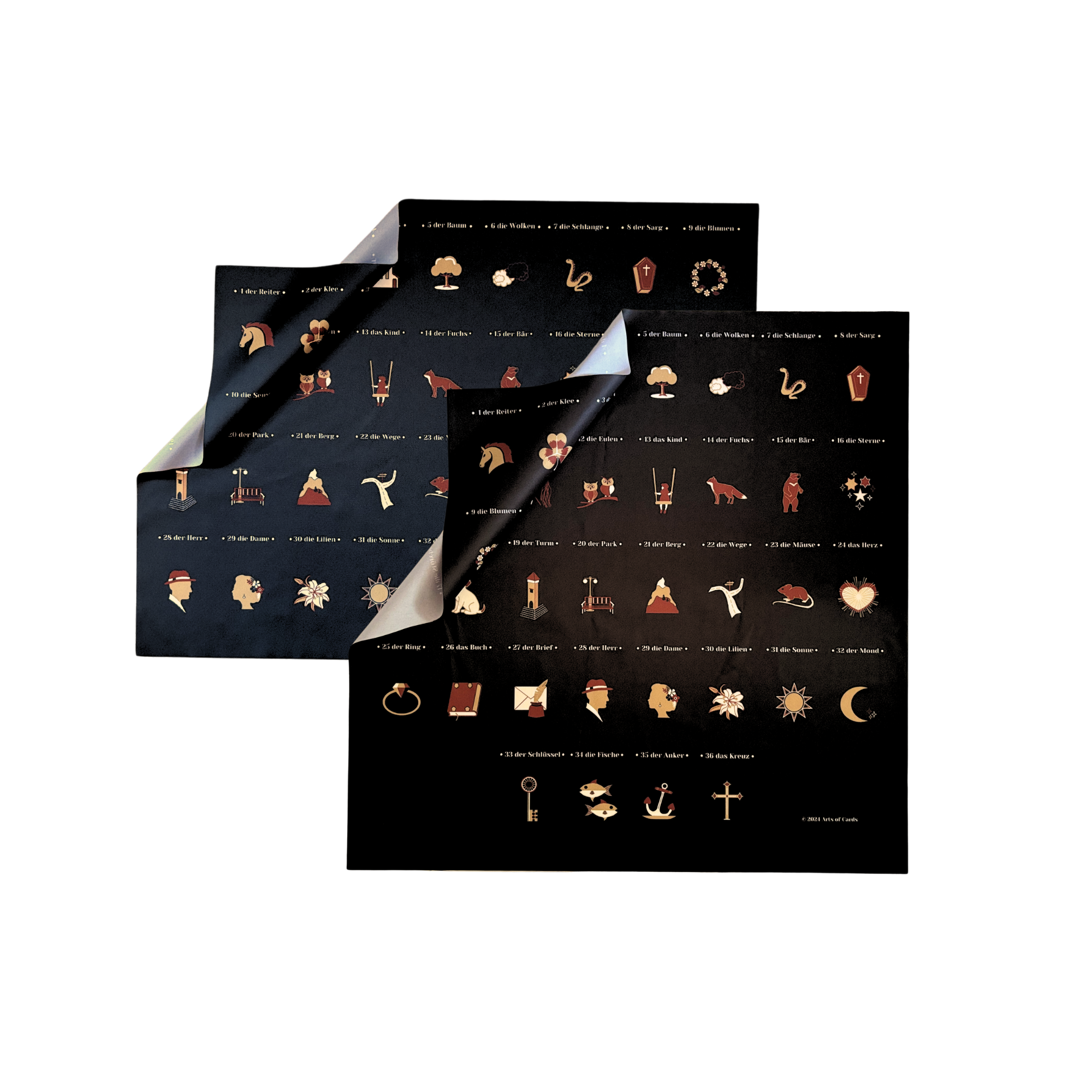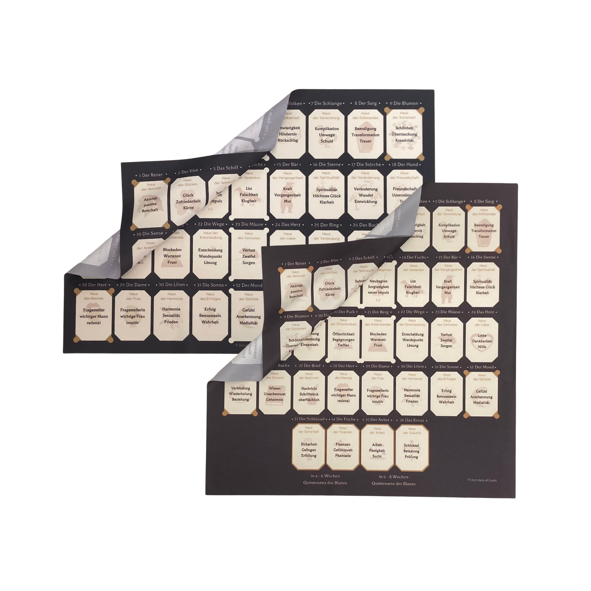 1 x Auslegetuch: bedruckt mit den Häuserplatz-Titeln der Großen Tafel und den Lenormandsymbolen.