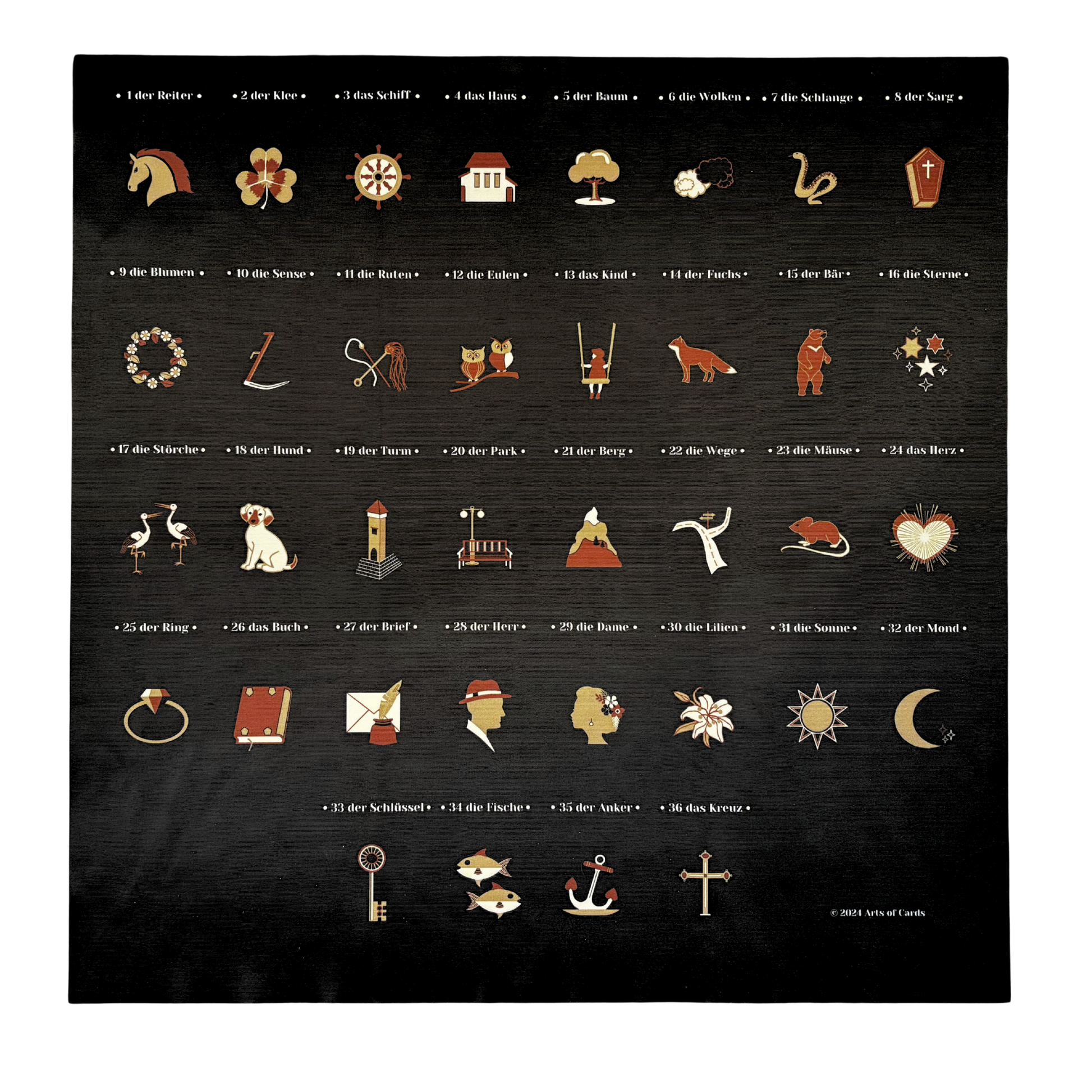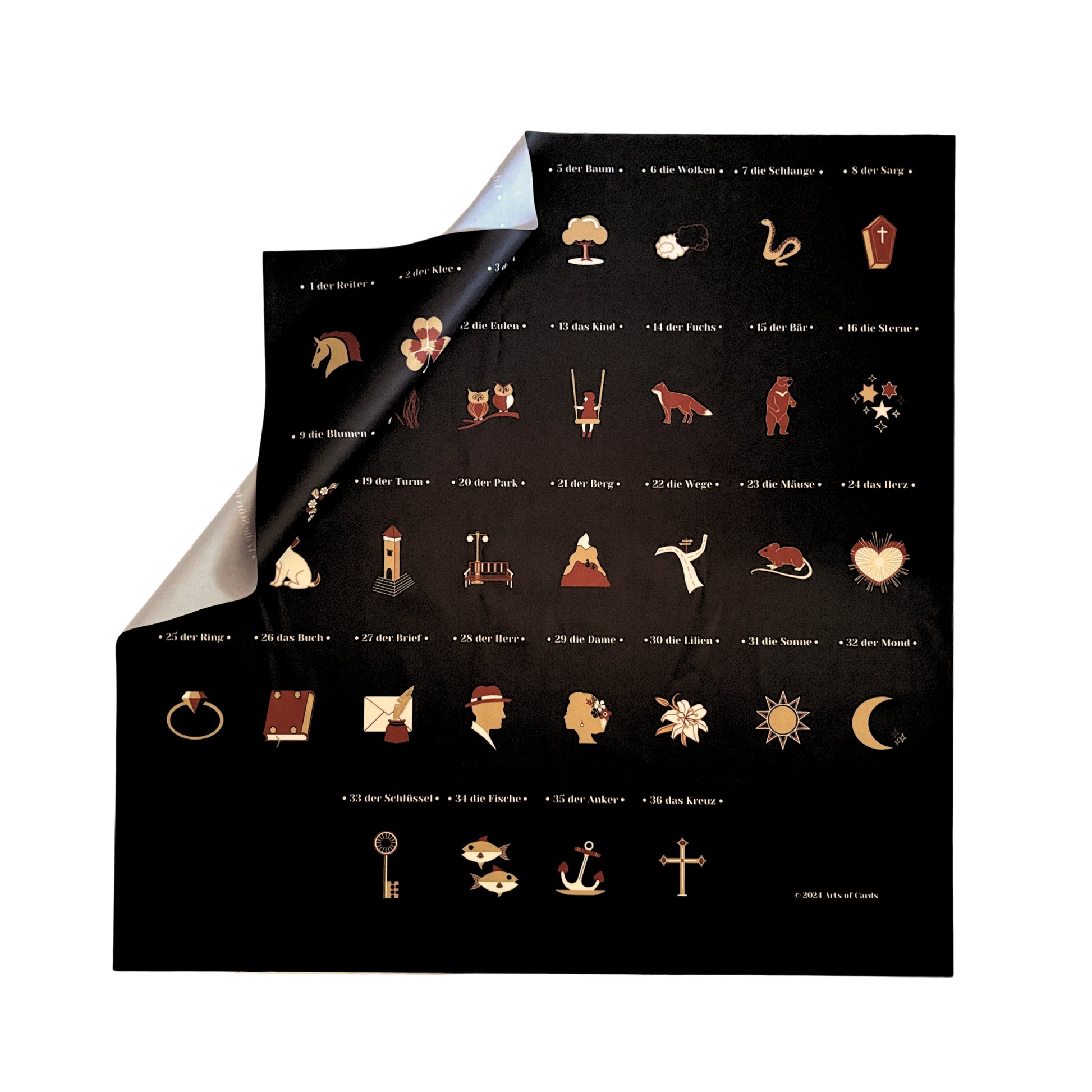 Dazu enthält es ein Tuch ohne Hinweise. Nur mit den Titeln der Häuserplätze und Symbolen der Lenormand Legung.