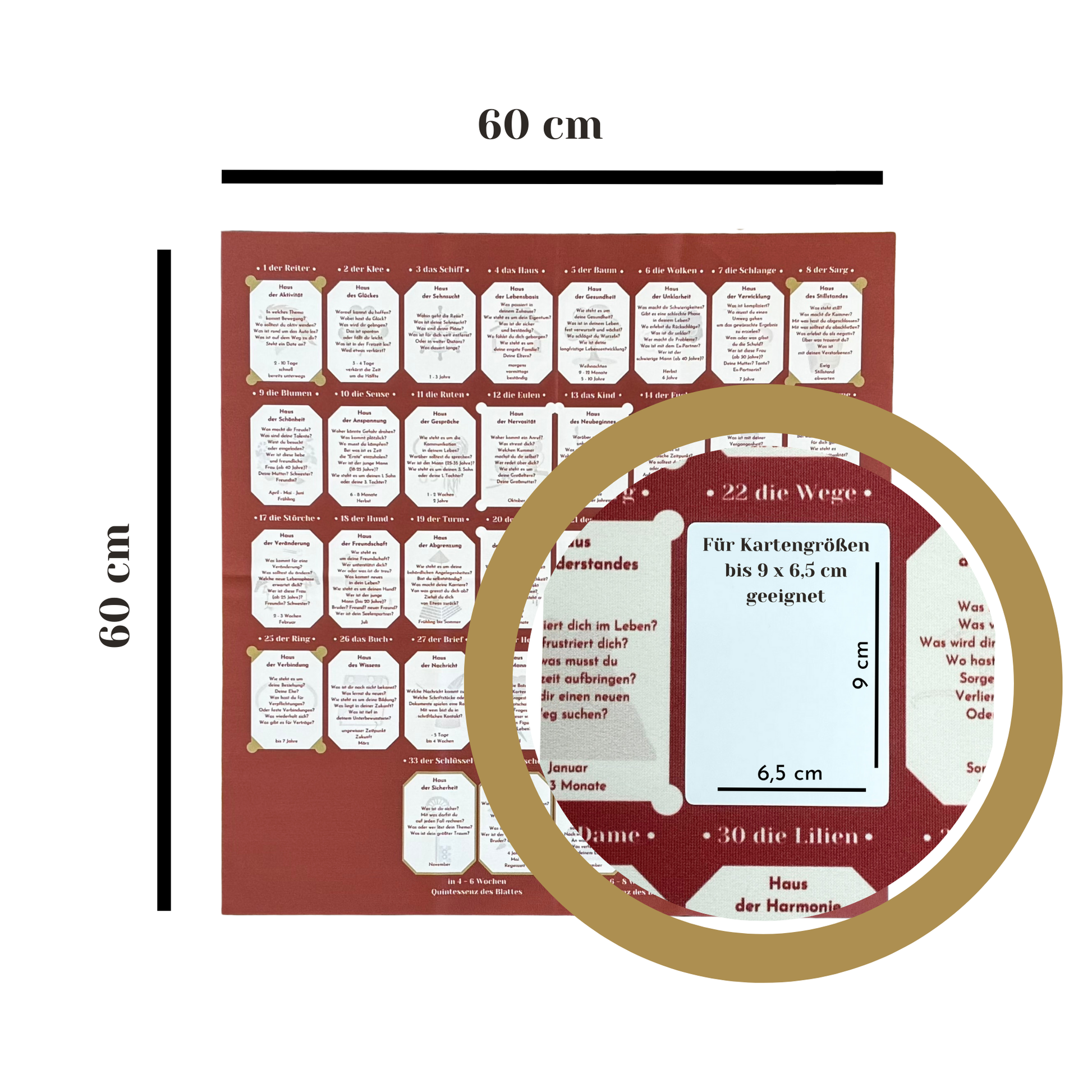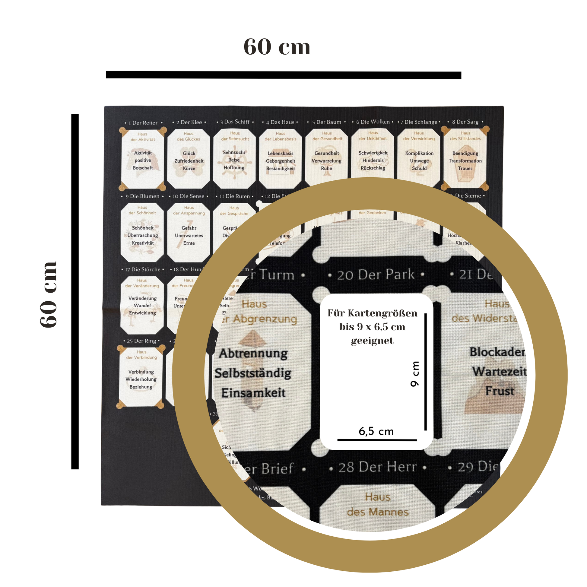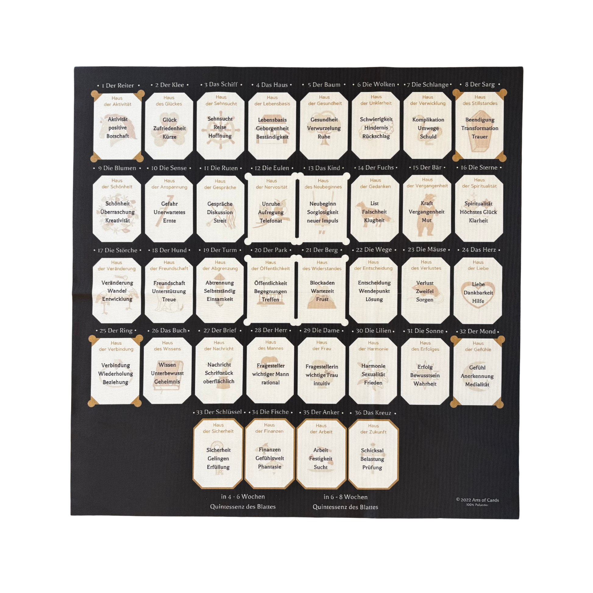 Dazu enthält es ein Tuch mit wenigen Hinweisen. Nur mit den Titeln der Häuserplätze und Symbolen der Lenormand Legung.